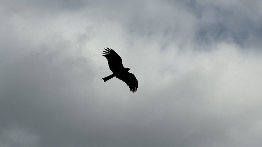 二人の上空にはトンビが舞っています