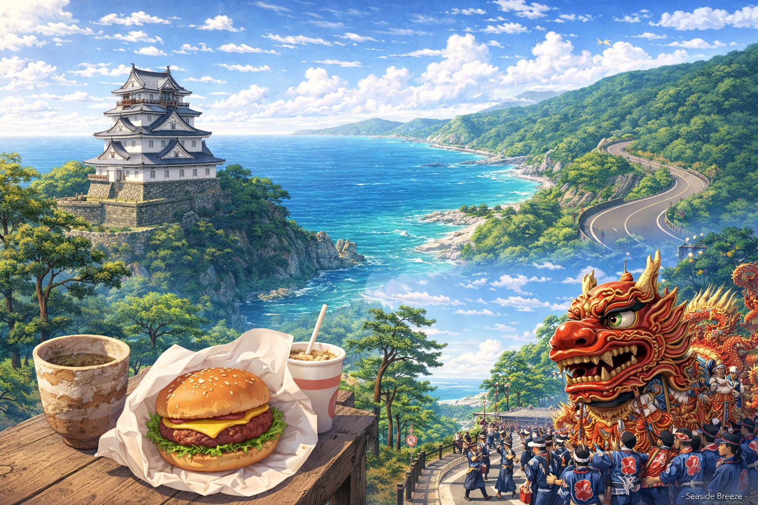Karatsu also has its own local flavors. One well-known example is the “Karatsu Burger,” often served from small mobile stands near the pine forest. This simple but delicious food has become a beloved part of the local culture.