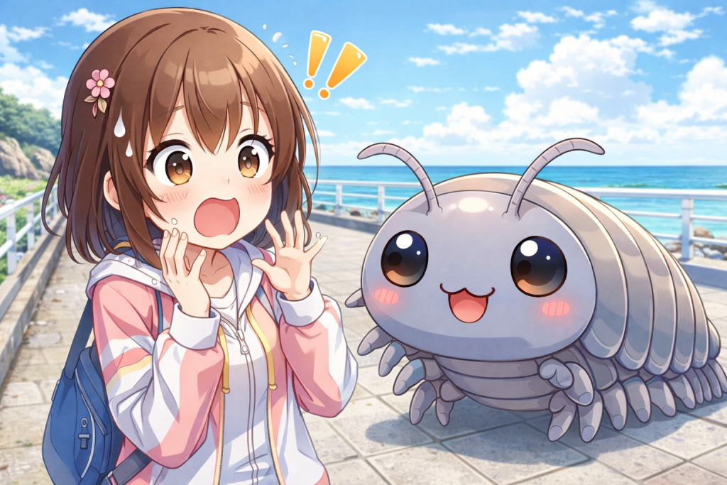 視界に何か動くものが入ってきました。ちょっと小さいけど、動きが早い。フナムシです!ついに出てきました。1センチくらいの小さいものはまだいいんですが、デカいのもいます、3センチはありそうです。黒光りしてまるでゴキブリですよ、おまけに素早い。同じように足が多い生き物に、ダンゴムシっているじゃないですか。あれは動きも遅いし可愛い感じがするので見かけても平気なんですね。でもこの3センチくらいあるフナムシは、驚くべき速さで遊歩道を移動しています。どこがムシなんだよ!って叫びたくなるくらい恐ろしい見た目ですよ。